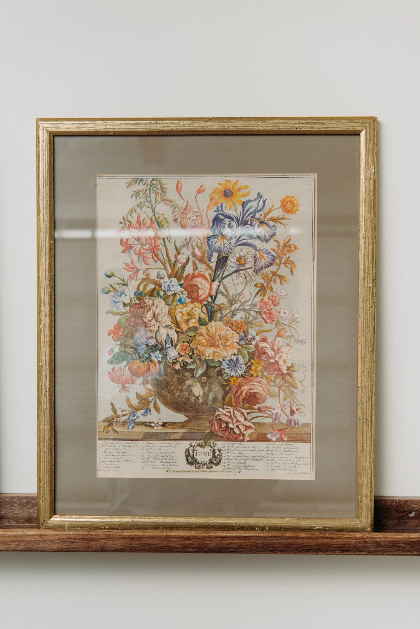 This vintage pair of botanical engraving overflows with abundant, detailed florals — a celebration of color, life, and the art of study. Each piece features vivid blossoms arranged in a footed vase, surrounded by Latin inscriptions and ornate floral borders. The gold wooden frames and mismatched mats only add to their collected charm, making them a perfect set for a kitchen nook, entryway, or gallery wall.
