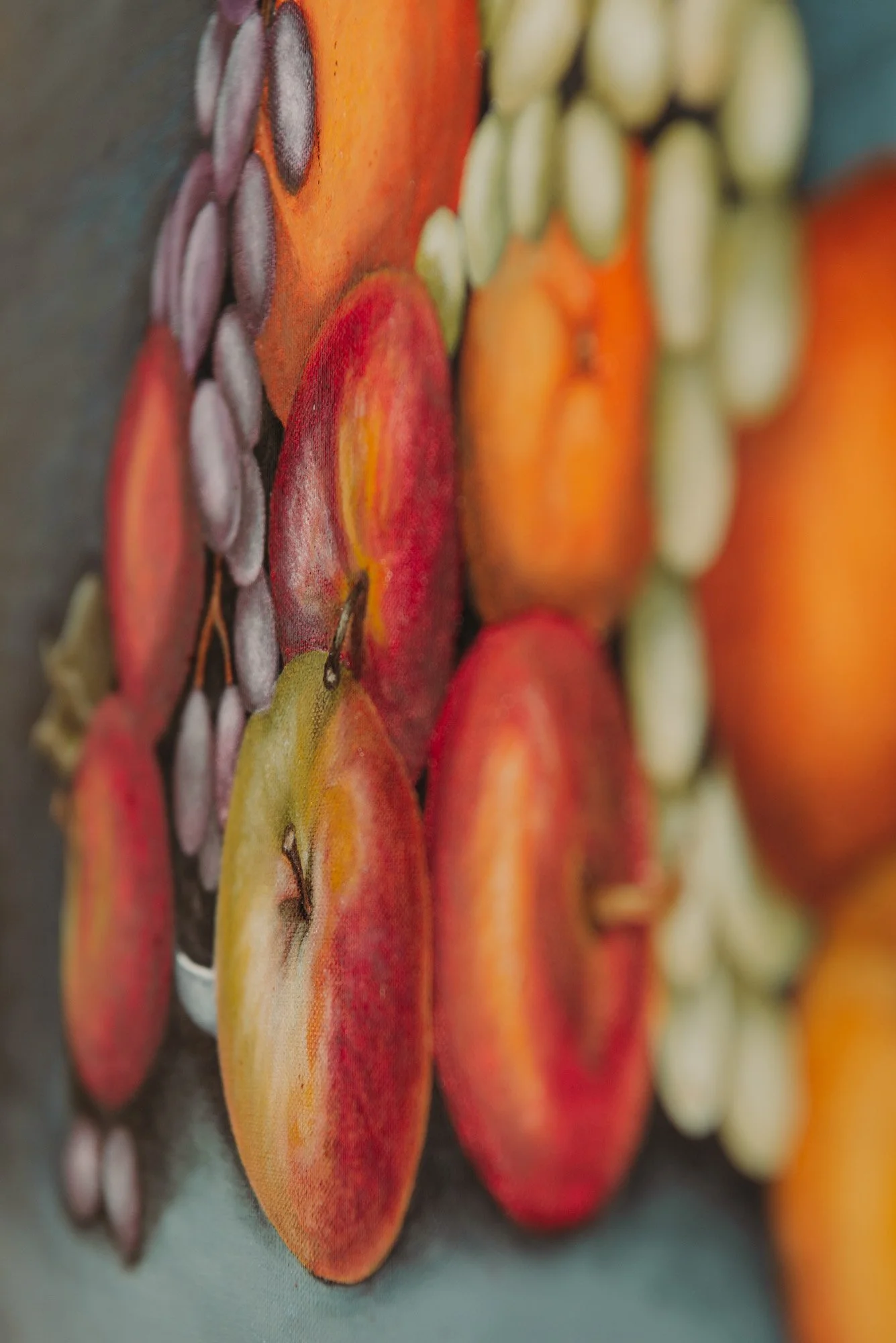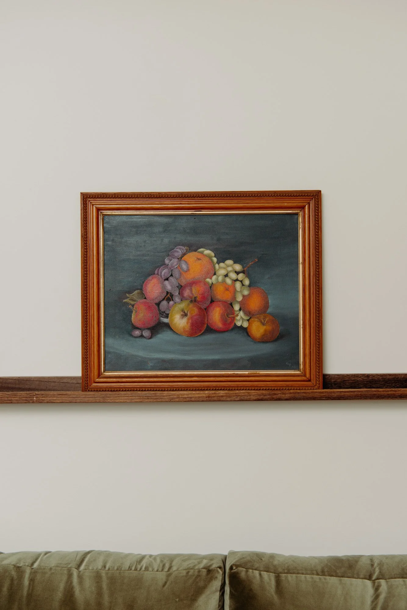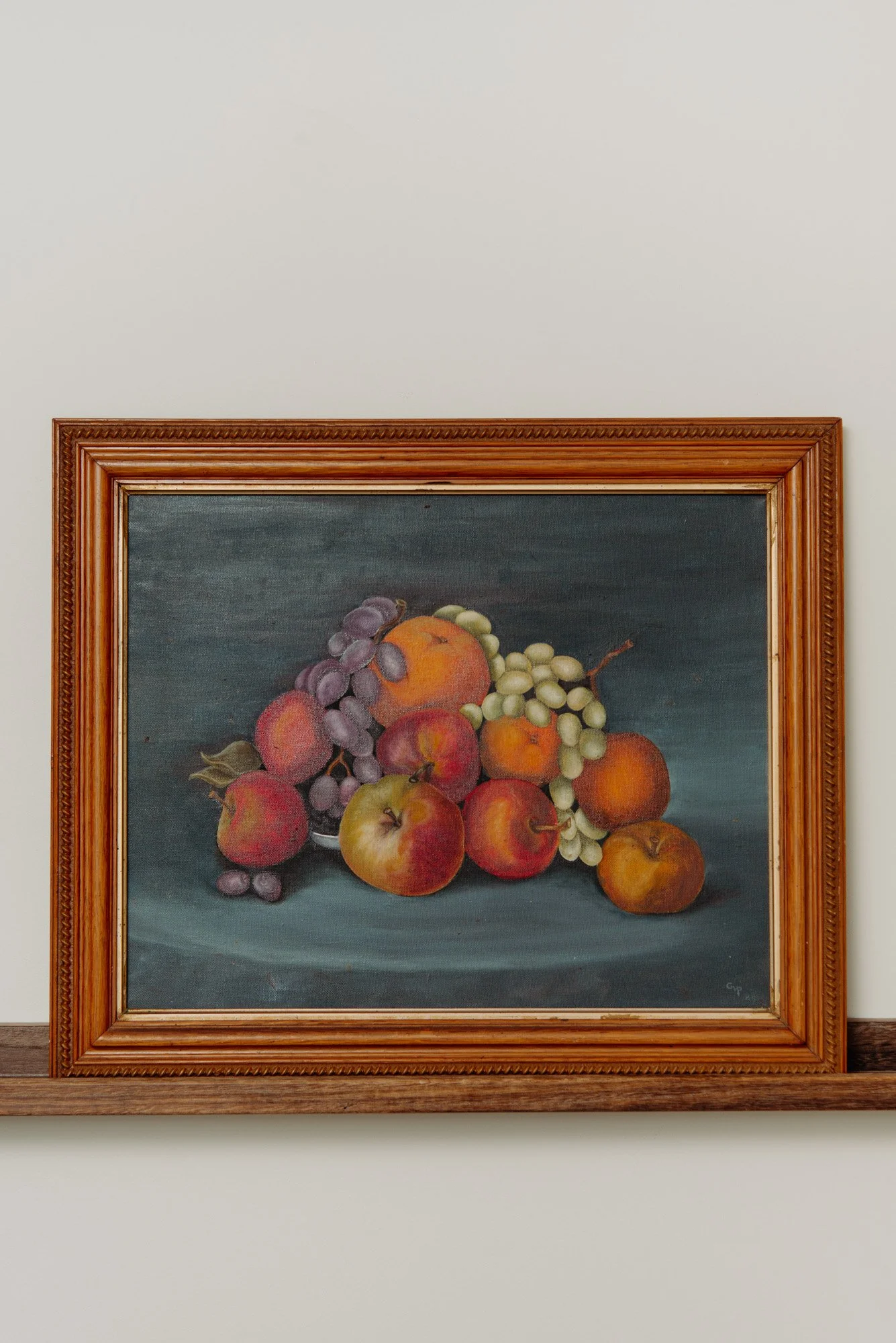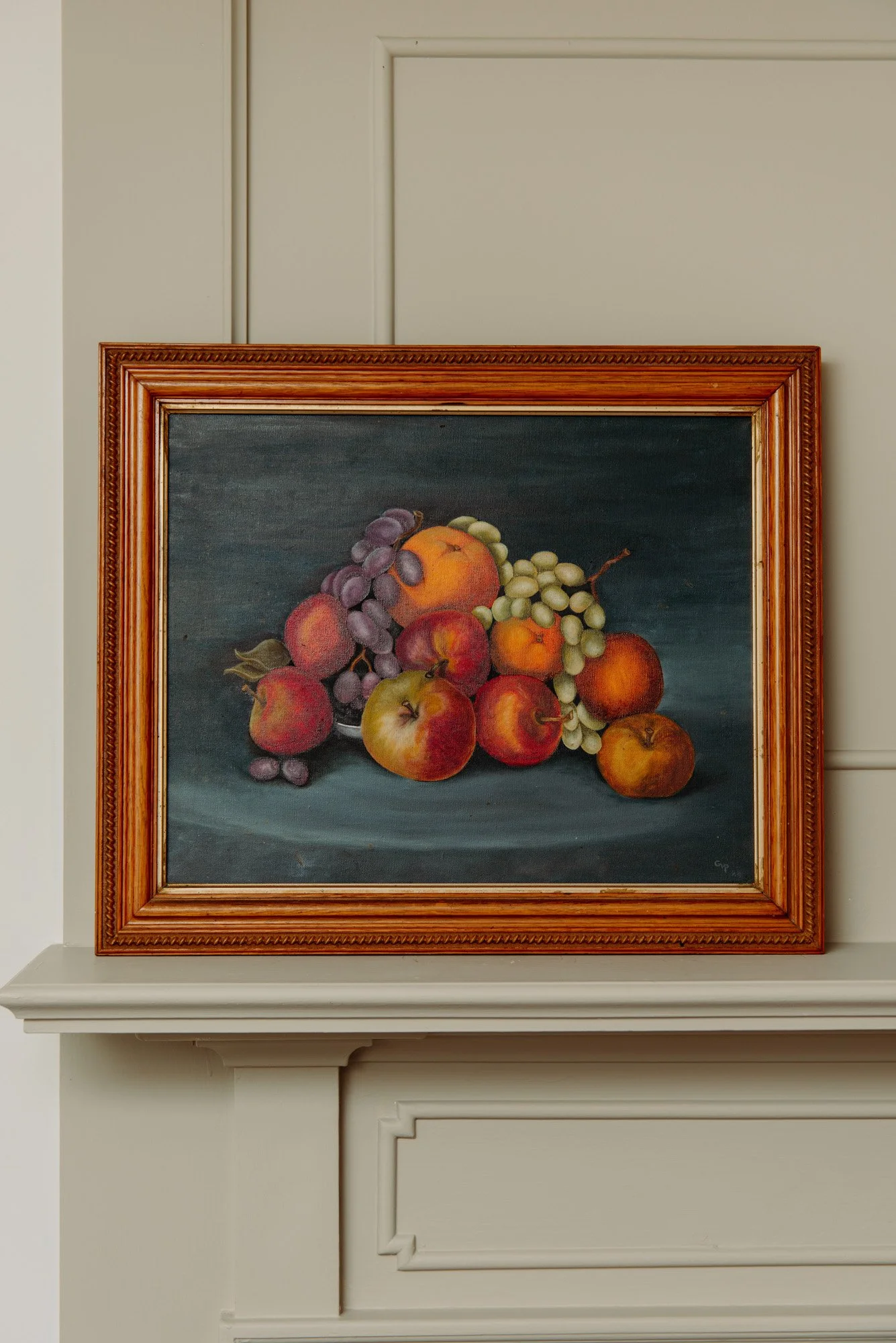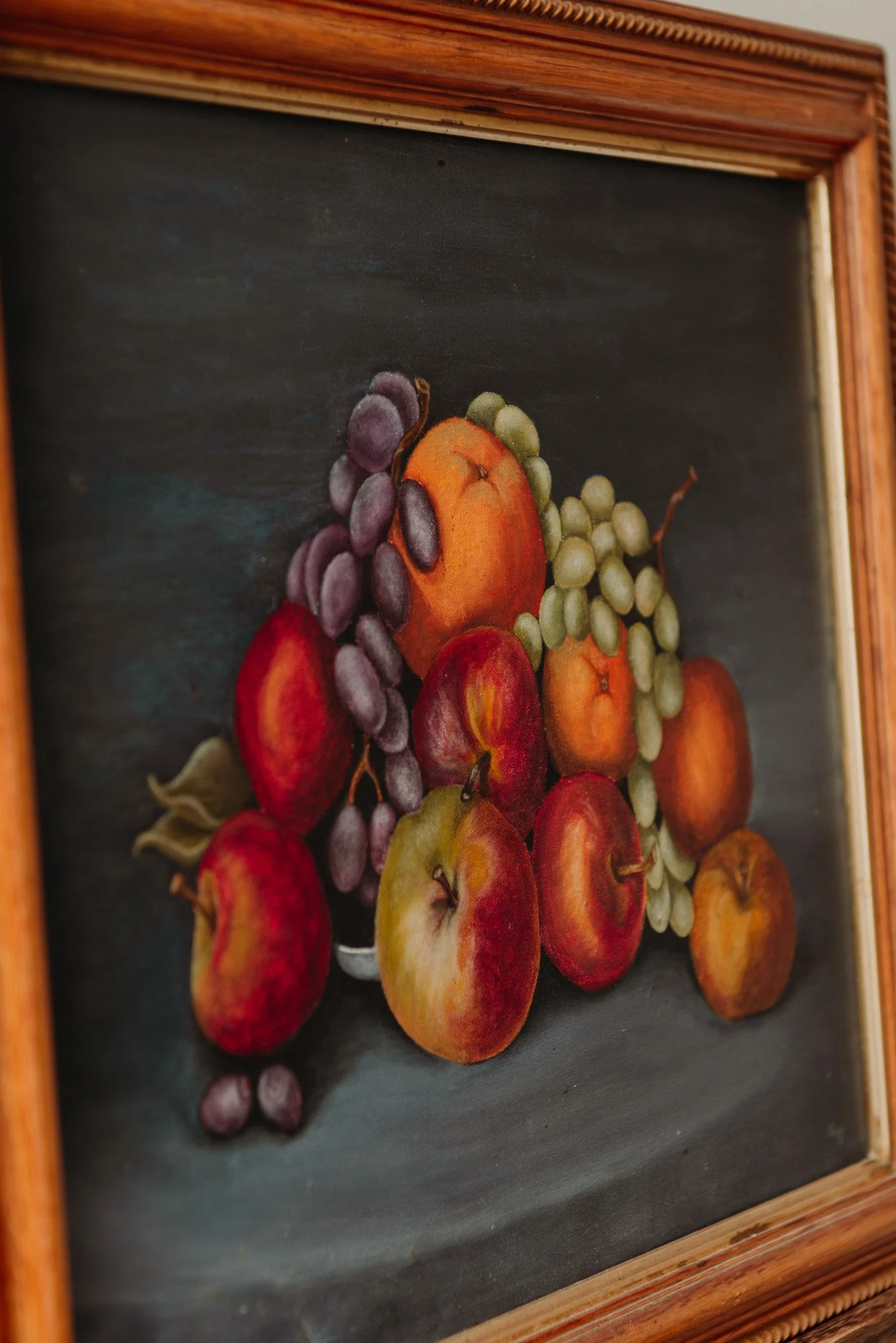 This vintage oil painting celebrates the simple abundance of fruit — apples, grapes, pears, and pomegranates gathered in rich, moody tones atop a shadowed blue backdrop. With its luminous brushwork and golden wooden frame, it brings old-world elegance and slow-living energy to your kitchen, dining space, or still corner of your home.