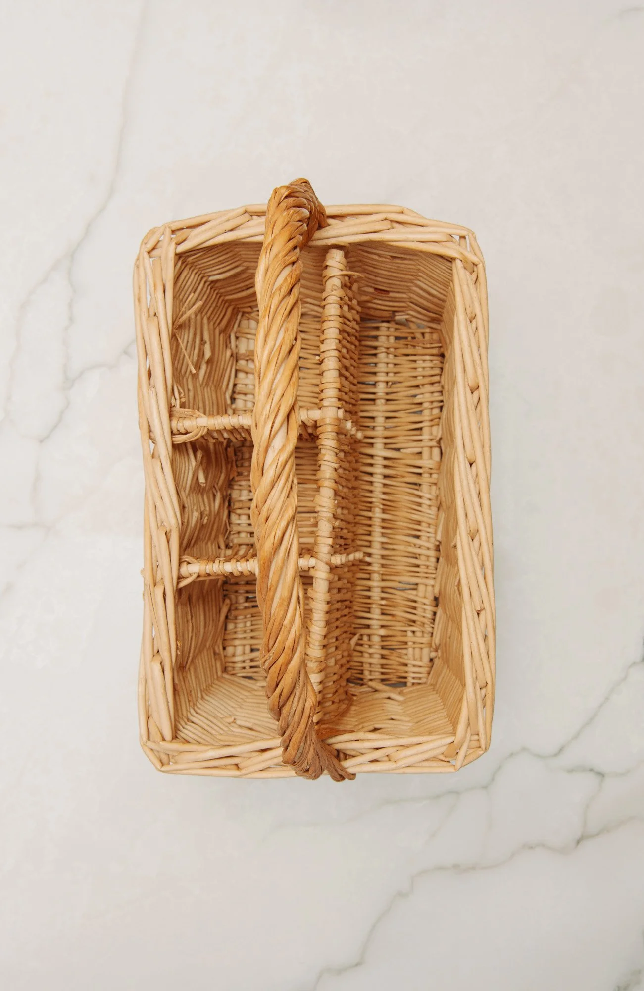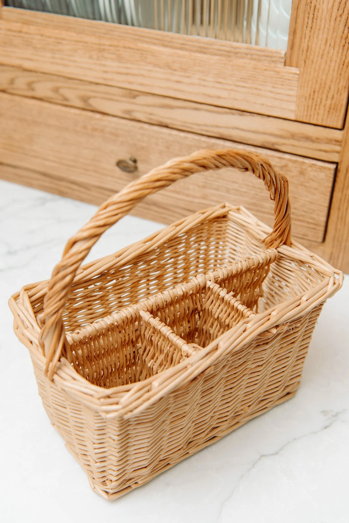 This handwoven basket with four interior compartments and a twisted handle is made for moments both everyday and special. Ideal for gathering silverware for an outdoor meal, holding brushes or craft tools, or serving as a tabletop centerpiece with dried blooms or pantry jars. Light in weight but full of charm, it’s a piece that carries rhythm, not just things.